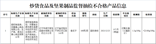 (三)辽宁华润万家生活超市有限公司沈辽分公司销售的、标称安徽真心食品有限公司授权黑龙江真心食品有限公司生产的香瓜子,其中过氧化值(以脂肪计)检测值不符合食品安全国家标准规定。