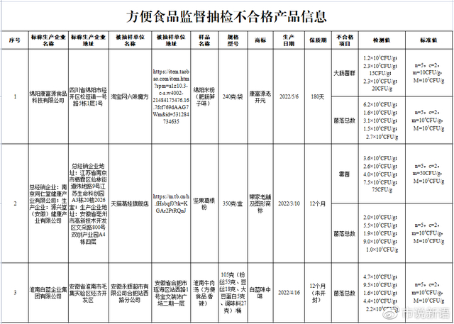 (五)安徽永辉超市有限公司合肥站西路分公司销售的、标称安徽省淮南白蓝企业集团有限公司生产的淮南牛肉汤(方便食品 香辣),其中菌落总数不符合食品安全国家标准规定。
