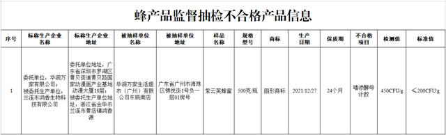 (二)广东省华润万家生活超市(广州)有限公司东晓南店销售的、标称广东省深圳市华润万家有限公司委托浙江省金华市兰溪市鸿香生物科技有限公司生产的紫云英蜂蜜,其中嗜渗酵母计数不符合食品安全国家标准规定。