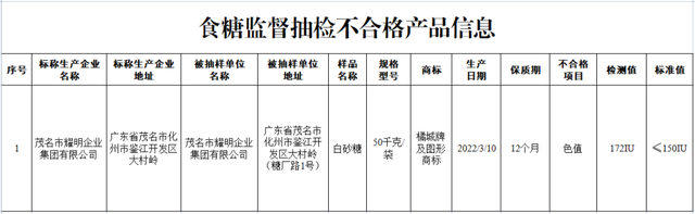 (四)广东省茂名市耀明企业集团有限公司销售的、标称广东省茂名市耀明企业集团有限公司生产的白砂糖,其中色值检测值不符合食品安全国家标准规定。