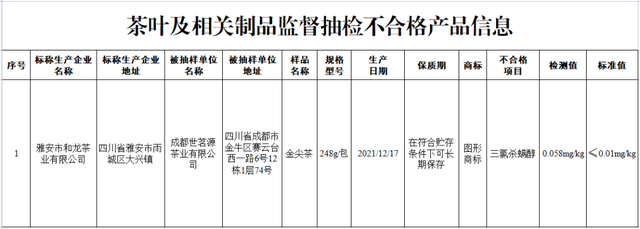 四川省成都世茗源茶业有限公司销售的、标称四川省雅安市和龙茶业有限公司生产的金尖茶,其中三氯杀螨醇残留量不符合食品安全国家标准规定。
