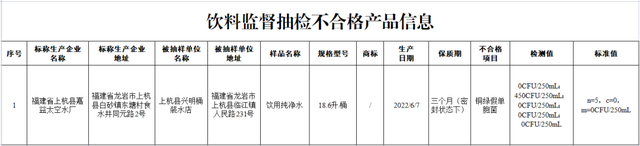 (一)福建省龙岩市上杭县兴明桶装水店销售的、标称福建省上杭县嘉益太空水厂生产的饮用纯净水,其中铜绿假单胞菌菌落数不符合食品安全国家标准规定。