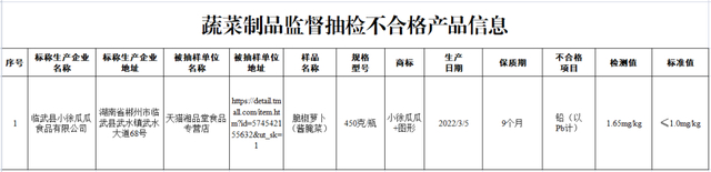 天猫湘品堂食品专营店(经营者为湖南湘品堂工贸有限责任公司)在天猫商城(网店)销售的、标称湖南省郴州市临武县小徐瓜瓜食品有限公司生产的脆椒萝卜(酱腌菜),其中铅(以Pb计)检测值不符合食品安全国家标准规定。