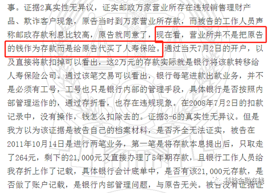 但任某却对这张保单发出质证,称自己当时到邮储银行万家营业所存款,工作人员声称邮政存款利息比较高,于是同意存款。现在看,营业所并不是把自己的钱作为存款,而是给自己代买了人寿保险。
