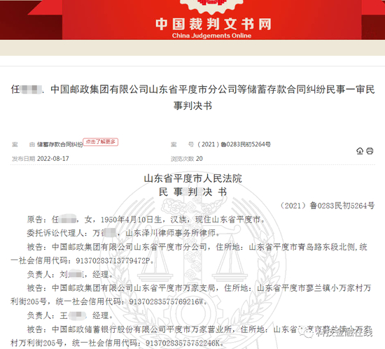 据判决书显示,2008年7月,家住山东平度市的大龄女储户任某,在邮储银行平度市万家营业所(下称:邮储银行万家营业所)开立账户并存入2万元存款。