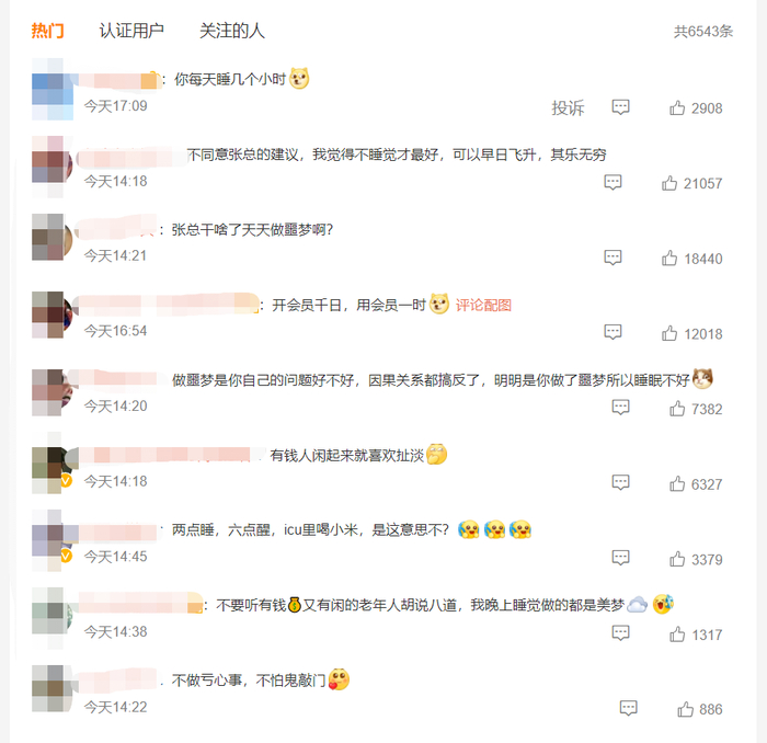 有网友表示:“不同意张总的建议,我觉得不睡觉才最好,可以早日飞升,其乐无穷”、“张总干啥了天天做噩梦啊?”......
