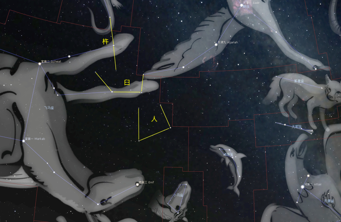 此外,在瓠瓜的东北方向,也就是西方天鹅座的“翅尖”位置附近,有三个连成一起的星官,也颇有意思。其中一个是杵,一个是臼(jiù),它们就是舂(chōng)米用的一对工具,显得非常形象。