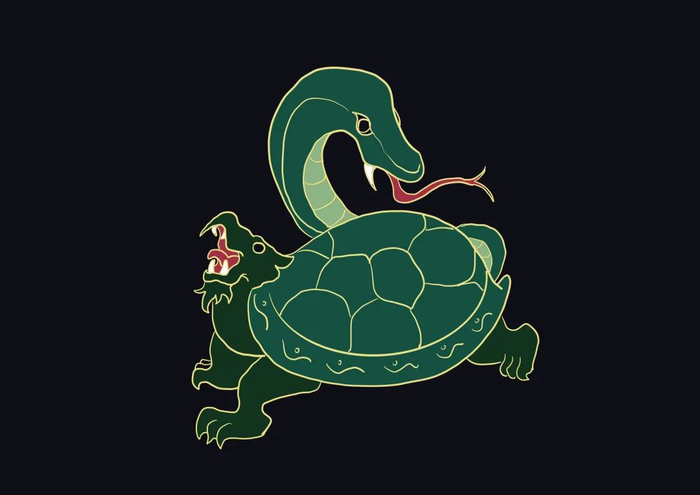 至于它为什么会出现在天空中紫微垣旁边比较显赫的位置,或许我们从《后汉书·张衡传》中所记载的张衡所作《思玄赋》中看出些许端倪。其中有这样一句:“玄武缩于壳中兮,螣蛇蜿而自纠。”玄武,原是玄冥,指神龟。神龟与神蛇相伴而行。在与张衡几乎同时期的曹操也留下了著名诗篇《龟虽寿》,开头两句便是:“神龟虽寿,犹有竟时。螣蛇乘雾,终为土灰。”也能看出神龟与螣蛇都被认为是有“灵气”的动物,且关系紧密。在汉朝以后,神龟和螣蛇合体成为新的玄武。
