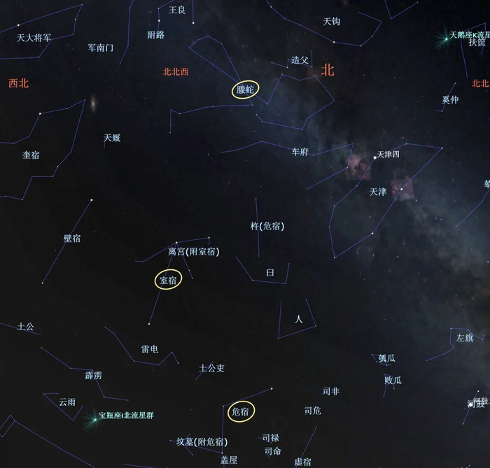 再看天上,螣蛇所在的位置是二十八宿中的危宿和室宿,它们是北方玄武七宿中的第五宿和第六宿。所以,推测螣蛇应该是一个很古老的星官,彼时,它与神龟尚未合体,因而独立存在与北天。而唐宋之后将玄武解释为“龟背蛇身”,于是,后人也将螣蛇视作玄武的分身。