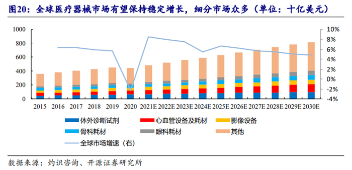 据灼识咨询数据统计及预测,2015 年至2020年,全球医疗器械市场复合增长率为4.3%。2020年因受疫情影响有所下降,但今后十年中有望保持5%以上年增长率,到2030年预计规模将突破8000亿美元。