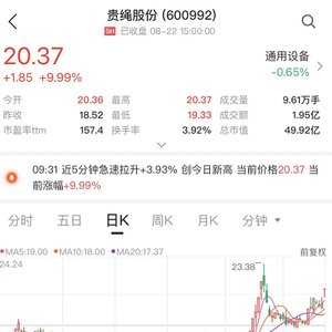 因涉酒传闻,贵绳股份的股价从7月12日的盘中低点12.51元/股,一路上涨到7月21日的盘中高点23.38元/股,7个交易日股价最大涨幅近九成。自7月21日创下阶段新高23.38元/股后,贵绳股份股价开始回调,但近期又开始出现上涨态势。8月22日,贵绳股份涨停,报收20.37元/股。