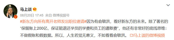 “因为有俞敏洪,看好新东方的未来”。面对教育行业整体滑坡的大环境,俞敏洪 “保留账上200亿,保证能退还学员的学费和员工的遣散费”的话语,网友点赞称其具有“非常好的底线思维”。