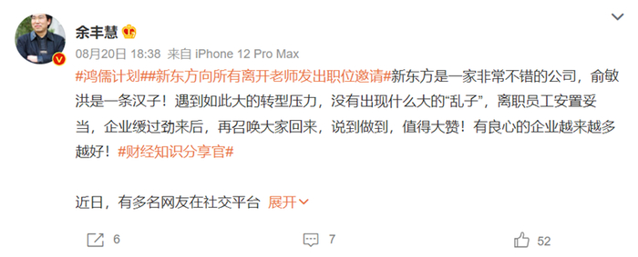 还有网友点赞新东方是一家有良心的企业:“遇到如此大的转型压力,没有出现什么大的乱子,离职员工安置妥当,企业缓过劲来后,再召唤大家回来,说到做到”。