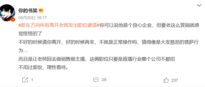而认为新东方炒作的理由是,“不好的时候请你离开,好的时候再来,不就是正常操作吗?”,“而且是让老师回去做销售做主播,这俩职位只要是直播行业哪个公司不都招?”网友认为新东方营销“用力过猛”。
