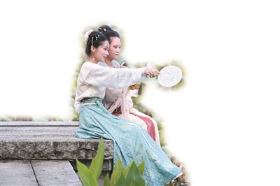 穿着汉服的游客在飘逸的裙帐内聊天。