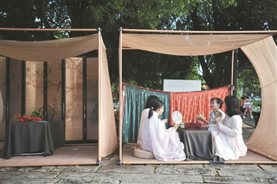 当天最亮眼的是还原唐代开元至天宝年间仕女们经常举办的户外郊游聚餐活动——裙幄之宴。飘逸的裙帐内摆上了精致的茶点,引来不少人驻足。“可以试试点心吗?”几位身着汉服的孩童好奇地望着裙帐,手捧酥点,相映成趣。