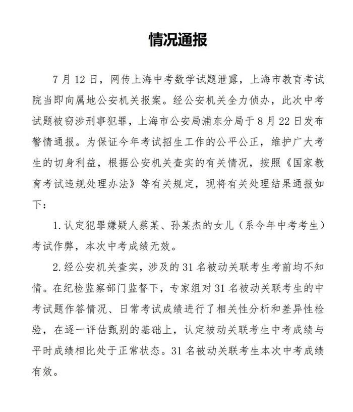 上海市教育考试院今天(8月22日)也发布情况通报称,根据公安机关查实的有关情况,按照《国家教育考试违规处理办法》等有关规定,认定犯罪嫌疑人蔡某、孙某杰的女儿(系今年中考考生)考试作弊,该生中考成绩无效。具体通报如下: