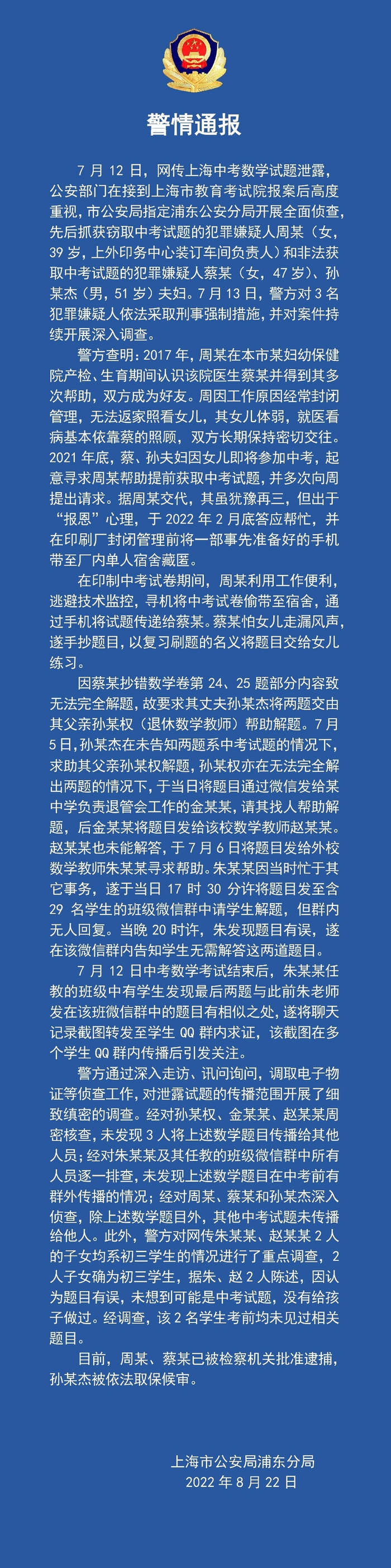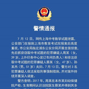7月12日,网传上海中考数学试题泄露。经上海公安机关全力侦办,现已查明今年上海中考试题被窃的案件事实。8月22日,上海市公安局浦东分局发布警情通报称,已对窃取中考试题的犯罪嫌疑人周某和非法获取中考试题的犯罪嫌疑人蔡某、孙某杰夫妇依法采取刑事强制措施。具体通报如下: