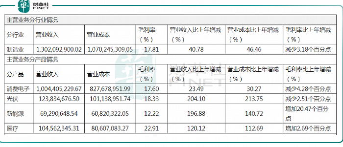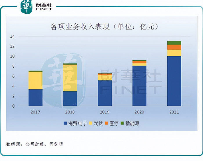 分产品看,高占比的消费电子产品造血能力却很一般,对应产品毛利率2021年为17.6%,同比下降了4.28个百分点;光伏产品毛利率亦同比下滑2.51个百分点。