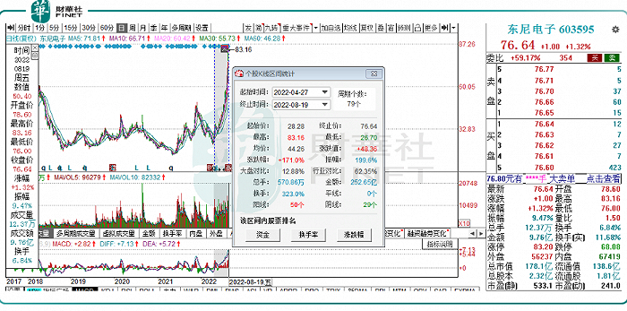 8月19日,东尼电子(603595.SH)延续强势,盘中一度触及83.16元/股,创下历史新高,随后股价震荡回落,收涨1.32%,报价76.64元/股;8月20日早盘,东尼电子股价高开1.2%,继续向历史高点发起冲击,但或许受大市和消费电子板块走弱影响,股价出现高开低走。截至发稿前,东尼电子股价为74.76元/股,跌幅为2.45%。