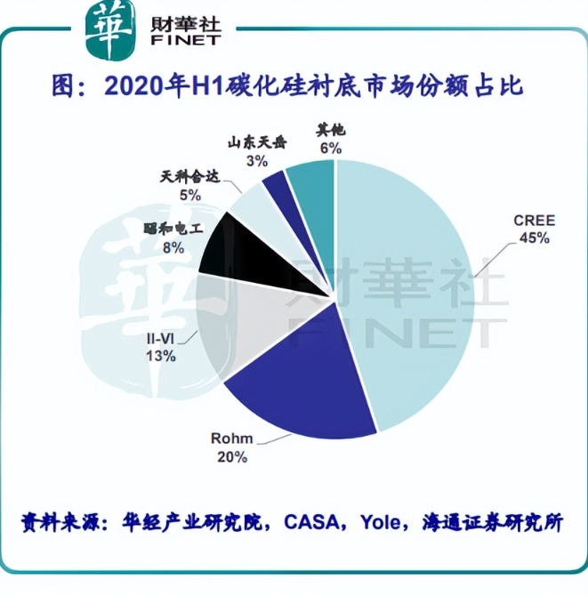 面对如此火热的碳化硅市场行情,大量半导体厂商急流勇进,其中份额最大的当属美国的Wolfspeed,根据Yole报告,截至2020年上半年,Wolfspeed市占率达到45%以上。