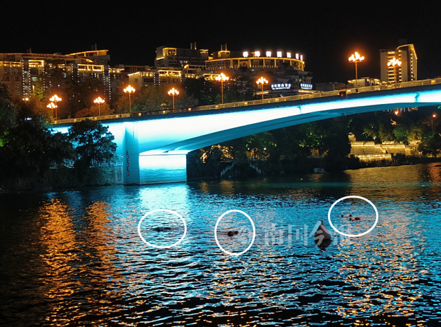 8月20日晚7时30分许,海巡10658船开始夜巡柳江河,刚驶离海事部门的趸船后不久,就在白沙大桥底发现有好几名市民进入到航道里游泳。