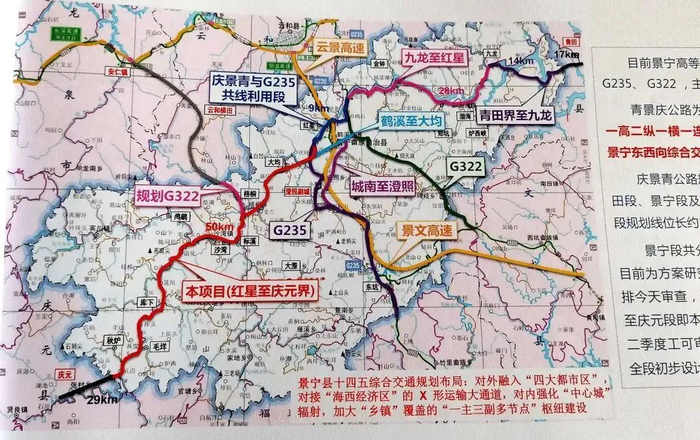 庆景青公路景宁段总投资66亿元,提升为国道后将有利于优化完善景宁路网布局,同时进一步突破项目建设用地瓶颈,大幅提升上级补助资金,为项目早日开工建设奠定坚实基础。