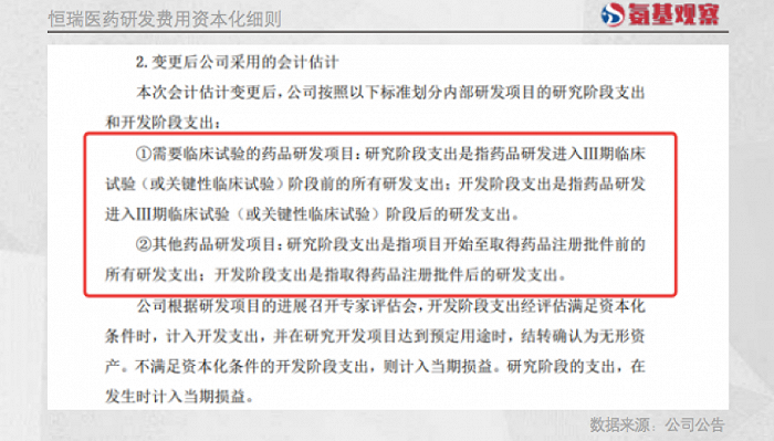 那么,恒瑞医药哪些研发费用会被资本化呢?根据去年恒瑞医药会计准则变更公告,我们可以看到,主要是三期临床费用。