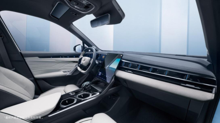 值得一提的是,官方表示其还配有环绕式情感光幕,通过液晶仪表与氛围灯的视觉效果和UI主题配合,27组氛围灯以长短不一的竖条形式贯穿中控台与两侧车门板,通过模拟声纹、呼吸、流水变化等,提供音乐律动和小憩模式等8种交互场景,营造出极强的科技感。