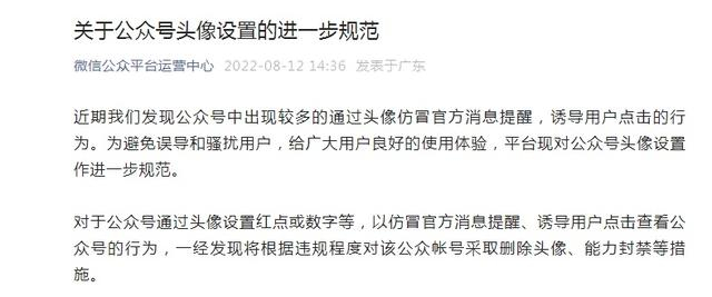 近期发现公众号中出现较多的通过头像仿冒官方消息提醒,诱导用户点击的行为。为避免误导和骚扰用户,给广大用户良好的使用体验,平台现对公众号头像设置作进一步规范。