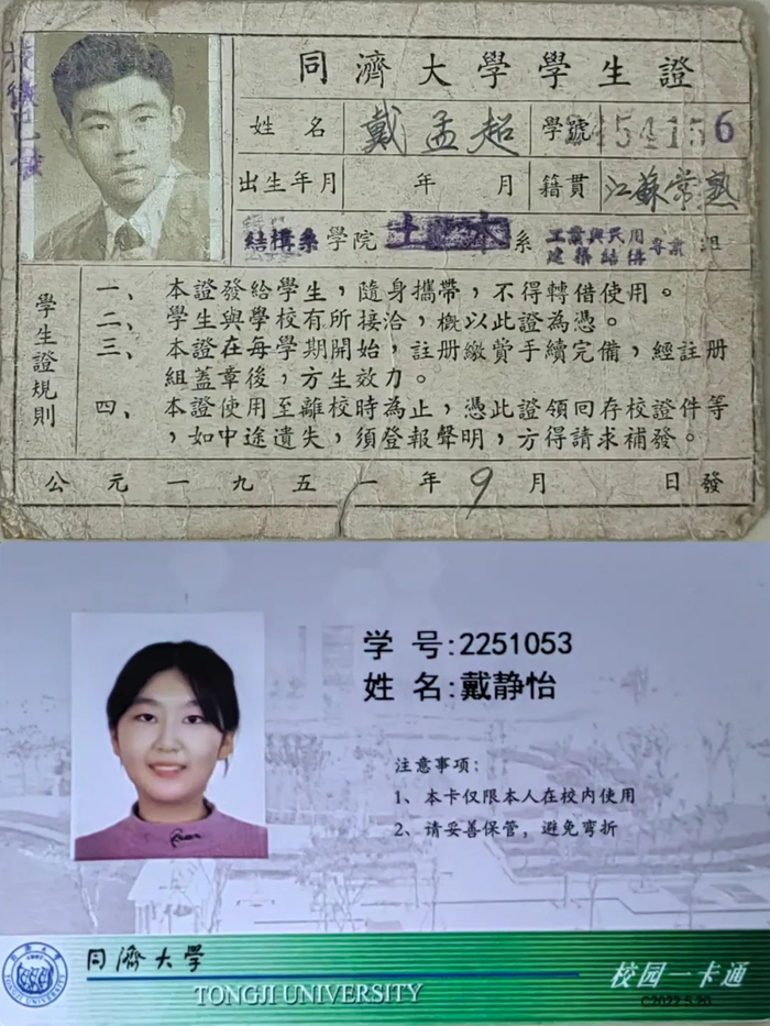 戴静怡的爷爷是1951级同济校友戴孟超先生。她从小就听着爷爷的故事长大,这样的言传身教让她立下了考同济的目标,同济对她来说不仅是一所百年名校,更是她的梦中情校。