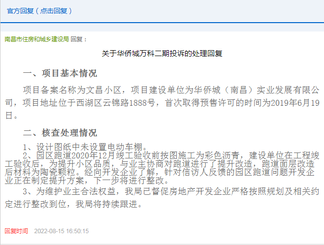 对此,南昌市住房和城乡建设局回复称,项目备案名称为文昌小区,项目建设单位为华侨城(南昌)实业发展有限公司,项目地址位于西湖区云锦路1888号,首次取得预售许可的时间为2019年6月19日。经核查,设计图纸中未设置电动车棚;园区跑道2020年12月竣工验收前,按图施工为彩色沥青,建设单位在工程竣工验收后,为提升小区品质,与业主协商对跑道进行了提升改造,跑道面层改造后材料为陶瓷颗粒。经向开发企业了解,针对信访人反馈的园区跑道问题,开发企业正在制定提升方案,下一步将进行整改。另外,为维护业主合法权益,该局已督促房地产开发企业严格按照规划,及相关约定进行整改到位,市住建局将持续跟进。