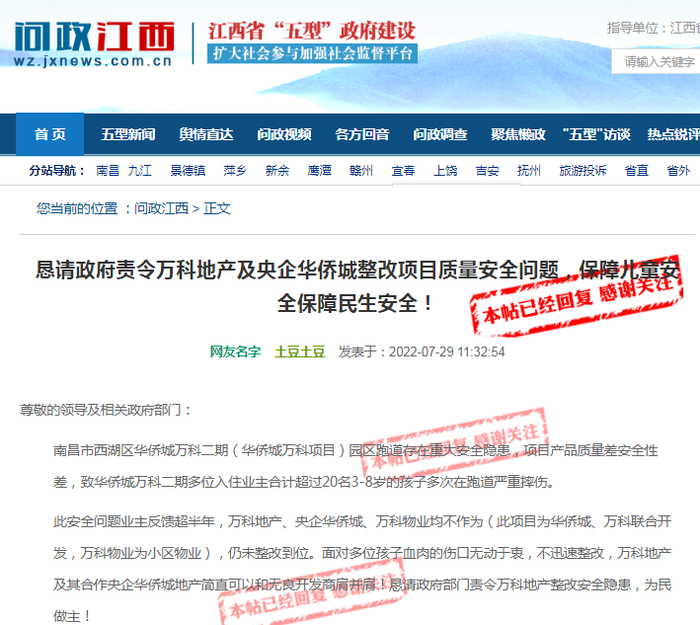 南昌华侨城万科一项目被投诉质量和安全性差 住建部门督促企业整改到位!