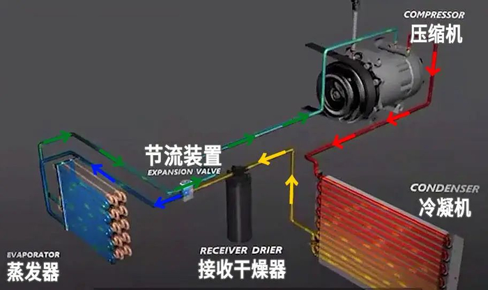 一般家用空调分为室外机和室内机,主要包括压缩机、冷凝器、节流装置、接收干燥器、蒸发器(室内机)等。室内空气可被处于室外的压缩机吸入蒸发器循环制冷,而降低温度,经过蒸发器时使湿度降低,这是一般空调房较干燥的原因。