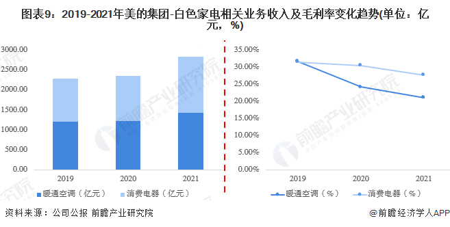 从美的集团白色家电相关业务收入及毛利率状况,2019-2021年,美的集团暖通空调及消费电器业务营收呈上升趋势,毛利率水平逐年降低。2021年,美的集团暖通空调业务实现营收1418.79亿元,同比增长17.05%;毛利率为21.05%,同比下降1.85个百分点。2021年,美的集团消费电器业务实现营收1318.66亿元,同比增长26.37%;毛利率为27.75%,同比下降0.66个百分点。总体来看,美的集团白色家电相关业务经营业绩良好,在行业内处于领先地位。
