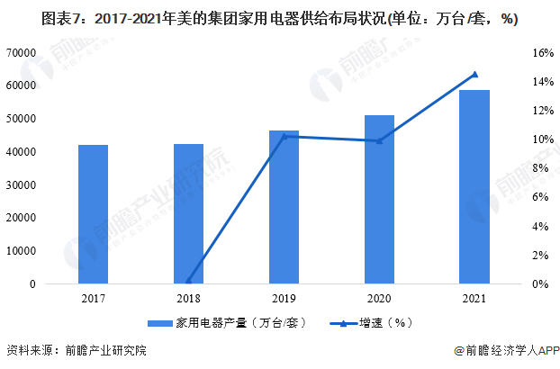 2017-2021年,美的集团家用电器产量呈上升趋势。2021年,美的集团家用电器产量为58507.47万台/套,同比增长14.50%。
