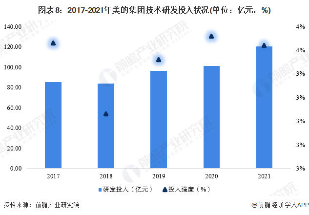 2017-2021年,美的集团研发投入金额呈现上升趋势。2021年美的集团研发投入金额为120.15亿元,相比2020年上升了18.74%;研发投入强度为3.52%,相比2020年小幅下降。