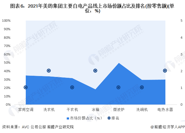 美的集团主要白电产品线上市场份额占比及排名来看,2021年,美的集团家用空调、干衣机、微波炉、洗碗机线上市场份额占比分别达到了34.6%、31.7%、49.7%和29.5%,排名第一;洗衣机、冰箱、电热水器线上市场份额占比分别达到了33.7%、18.2%和29.9%,排名第二。
