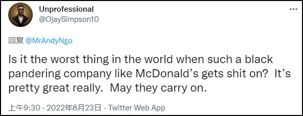 另有网友却表示,麦当劳此前对非裔“献媚”,现在发生这样的事情某种程度上是咎由自取,自己“喜闻乐见”。