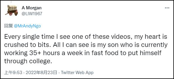 @LIW1967 表示,看到视频令他特别同情工作人员,因为自己儿子就在类似的快餐店工作,现在感到特别“痛心”。