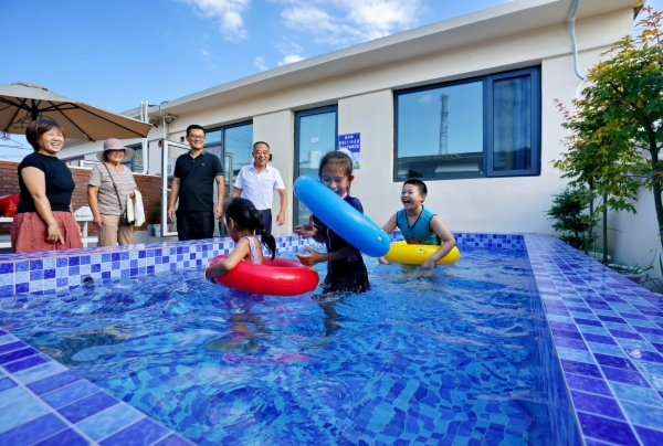 孩子在院内游泳池里玩水,大人在一旁烤肉串儿,满院的笑声,扑鼻的香气……8月15日下午,北戴河区海滨镇丁庄村栖山语海民宿内,来自河南的游客郭先生一家,玩得特别开心。