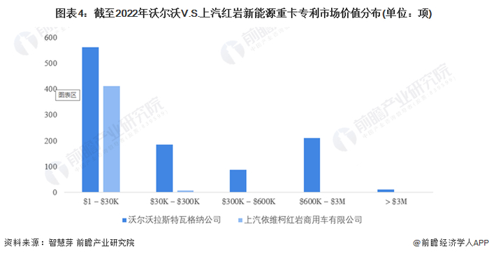 沃尔沃新能源重卡专利总价值高于上汽红岩,沃尔沃新能源重卡专利总价值为4.28亿美元。在专利价值分布方面,两公司新能源重卡专利价值主要集中在3万美元以下,其中沃尔沃企业专利价值分布在60-300万美元之间专利项目也较多。