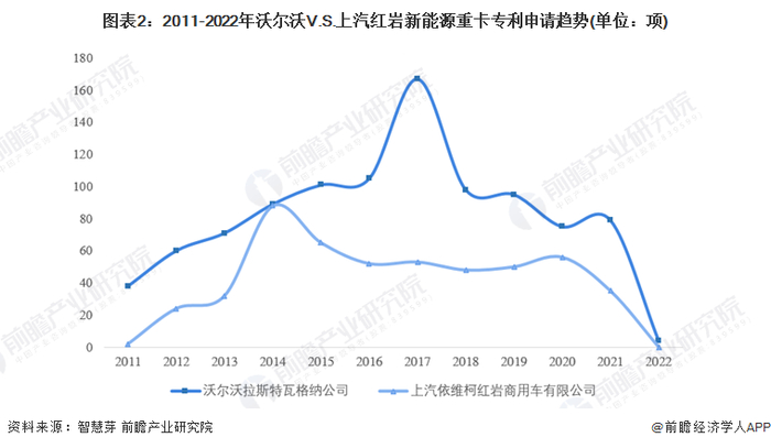 从趋势上来看,2011-2022年沃尔沃整体专利申请数量均高于上汽红岩,其中2014年两公司专利申请数量仅相差1项,其余年份沃尔沃专利申请数量均高于上汽红岩。