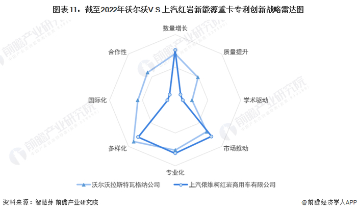 整体来看,沃尔沃新能源重卡技术在合作性、国际化、多样化、质量提升、学术驱动等方面具有相对竞争优势,上汽红岩新能源重卡技术则在数量增长、市场推动、专业化上具有相对竞争优势。