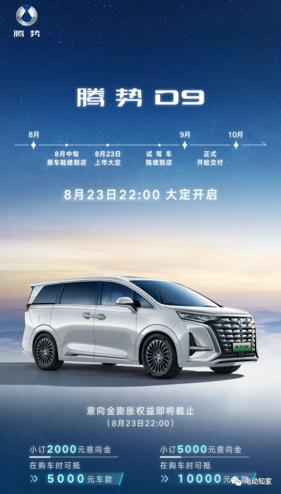 电动知家消息,比亚迪首款豪华MPV腾势D9将于今日(8月23日)正式上市并将于22点开启大定,交付时间为9月。作为腾势首款高端MPV车型,腾势D9拥有插电混动及纯电两种动力形式,此前公布的预售价为33.5-66.0万元。另外还有1款创始版,预售66万元,限量99台。