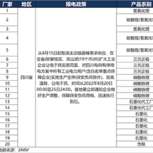 高温天持续,为了让电于民,四川限电时间再延长5日,此轮限电的持续时间为从2022年8月20日00:00至25日24:00。这使电池产业链的上游价格再次受到关注。