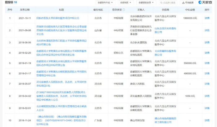 据天眼查显示招投标信息,该公司曾中标多个医院殡仪项目,包括民航总医院太平间承包服务项目、北京积水潭医院新街口院区太平间承包服务项目、首都医科大学附属北京地坛医院太平间殡葬服务项目、首都医科大学附属北京朝阳医院西院太平间委托管理项目等。