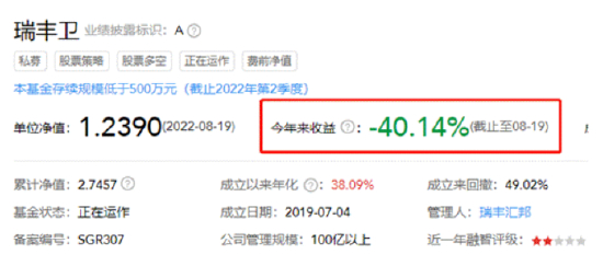 跌幅最大的一只基金名为瑞丰卫,这只成立于2019年7月4日的基金虽然截至今年8月19日的累计收益率有174.57%,但在今年内的跌幅却高达40.14%,而且截至今年二季度,其规模已经低于500万元。
