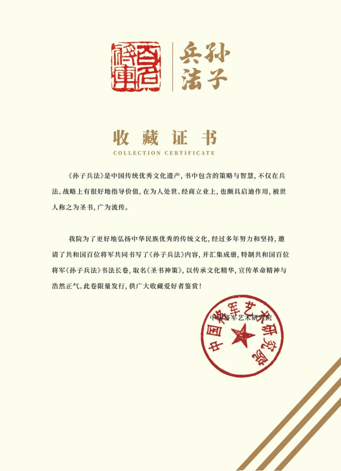 更重要的是,《孙子兵法》书法长卷——《圣书神策》是其中几位将军的绝笔之作,以后再也无法聚齐创作,收藏价值不言而喻。
