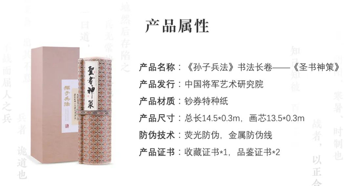 因《孙子兵法》书法长卷——《圣书神策》原稿具有很大的特殊意义以及特殊性,所以此次发行过后,原稿将进行封藏。